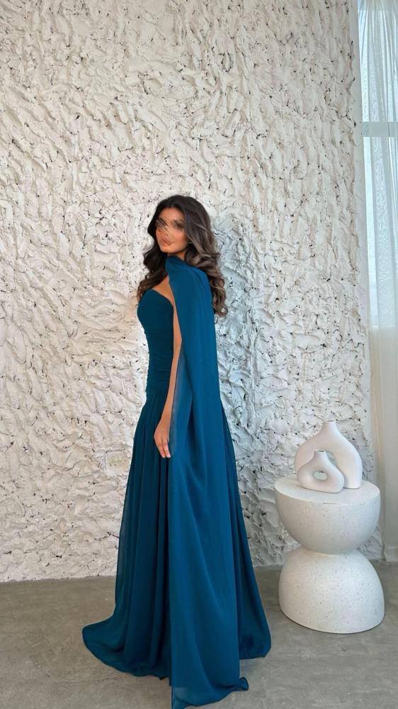 فستان سهرة أنيق بلون أزرق بترولي، يتميز بتصميم أنثوي راقٍ ومميز.
