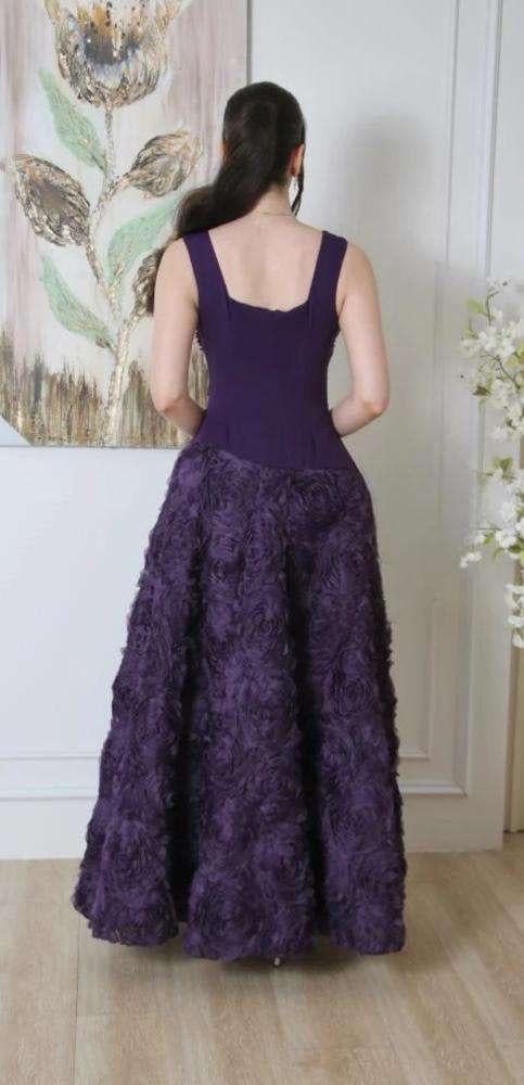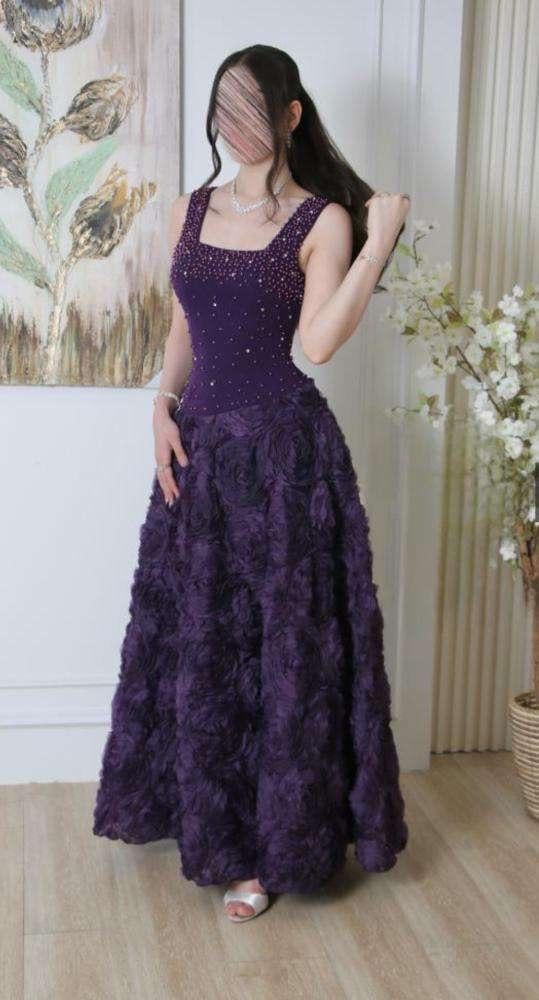 تألّقي بإطلالة ملكية مع هذا الفستان الأنيق باللون البنفسجي الساحر. يتميز الجزء العلوي بقصّة مربعة مرصعة بحبات لامعة تضيف لمسة فخامة، بينما تأتي التنورة الواسعة مزدانة بتفاصيل وردية بارزة تمنح الفستان حجماً ورونقاً مميزاً. تصميم يجمع بين الرقي والأنوثة، مثالي للسهرات الفاخرة والمناسبات الخاصة حيث تكونين محط الأنظار