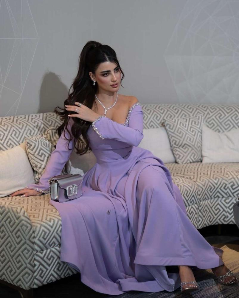 فستان سهرة أنيق بلون موف ناعم، يتميز بتصميم أوف شولدر وأكمام طويلة تضيف لمسة راقية وملكية. الجزء العلوي مزين بتطريزات ناعمة على طول حافة الصدر والأكمام، تمنحه لمسة فخمة ومميزة. القماش انسيابي وسميك قليلاً، ما يجعل الفستان ينسدل بأناقة وانسيابية على الأرض بقصّة واسعة تشبه فساتين الأميرات. مثالي لحفلات الخطوبة أو المناسبات المسائية الراقية، ويُكمل بإكسسوارات فضية كما هو ظاهر مع الحقيبة الصغيرة البراقة.