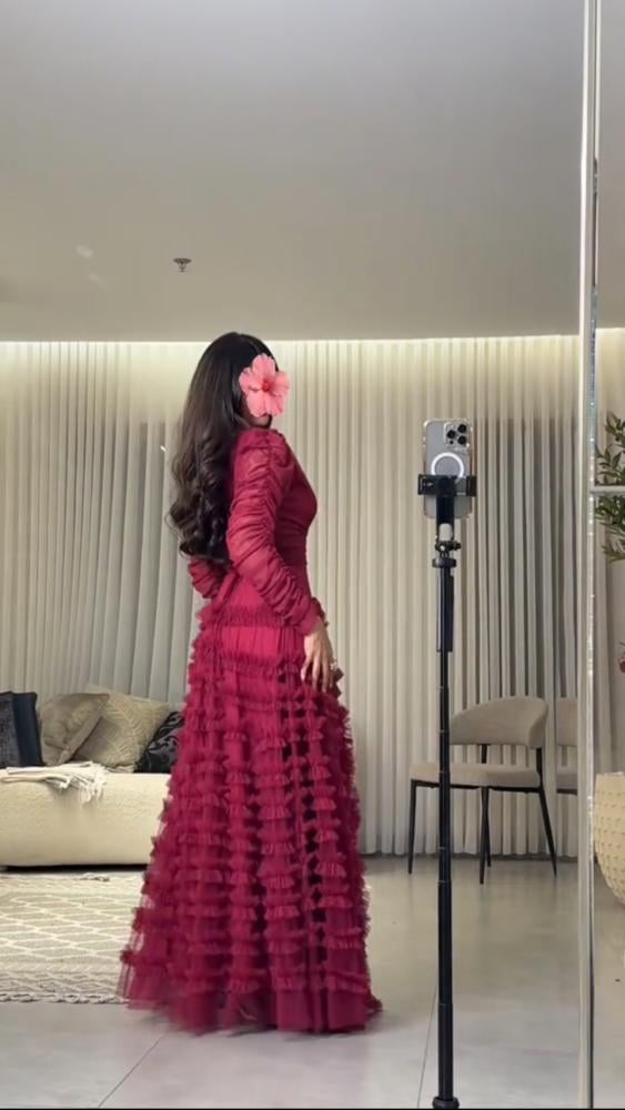 فستان سهرة فاخر بلون أحمر كرزي أنيق، بتصميم طويل انسيابي يمنح حضورًا ملوكيًا آسراً. يتميز بقبّة ملفوفة على شكل V وأكمام طويلة تضيف لمسة كلاسيكية راقية، بينما تتزين التنورة بطبقات غنية من الكشاكش الناعمة التي تعكس حركة أنثوية مبهرة مع كل خطوة. قماش فاخر وخياطة متقنة تجعل هذا الفستان اختيارًا مثاليًا للسهرات والمناسبات التي تتطلب إطلالة مترفة لا تُنسى