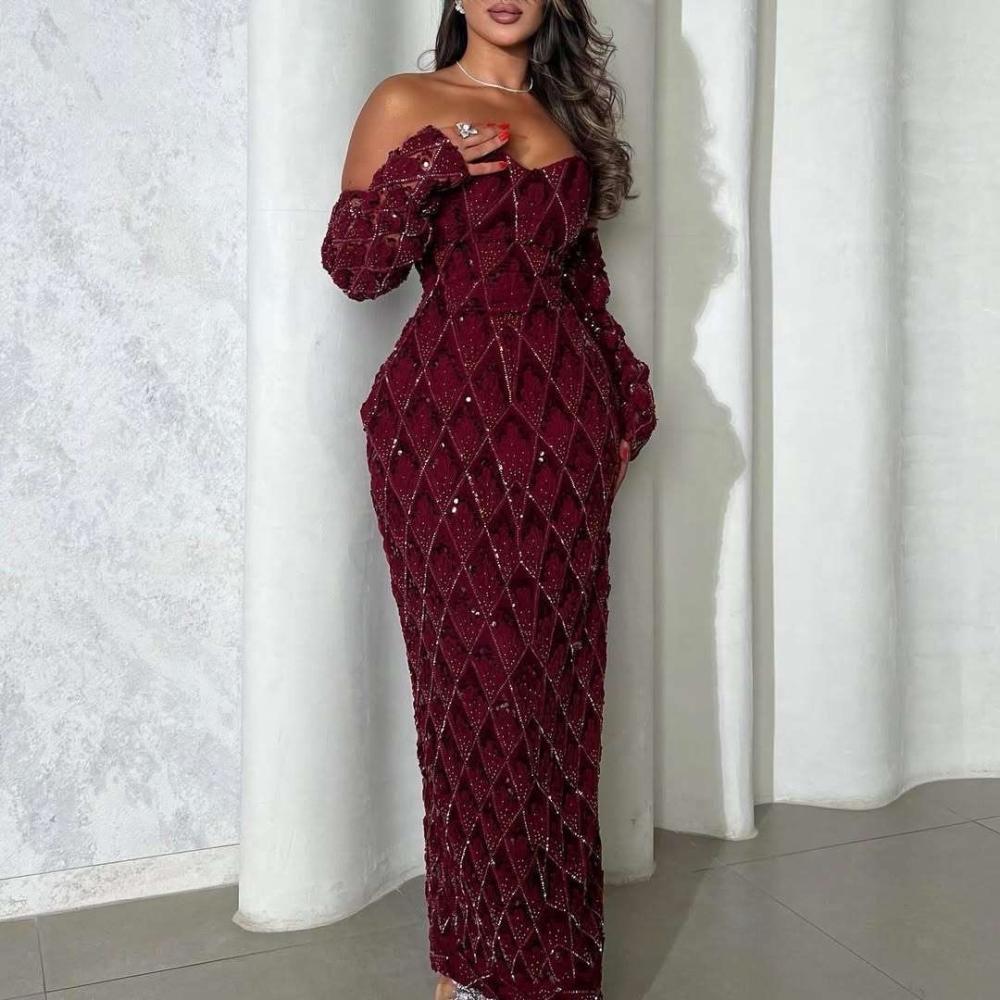 فستان سهرة أنيق بلون خمري فاخر، يتميز بقصّة ضيقة تُبرز جمال القوام، مع تصميم أوف شولدر يضفي لمسة أنثوية جذابة. مصنوع من قماش مطرّز بالكامل بنقوش هندسية لامعة على شكل معيّنات، مزيّنة بترتر ناعم يضفي بريقاً فاخراً. يتميز بأكمام طويلة منسدلة بنفس النمط المطرّز، ويجمع بين الفخامة والرقي، مما يجعله خياراً مثالياً للمناسبات المسائية والسهرات الراقية.