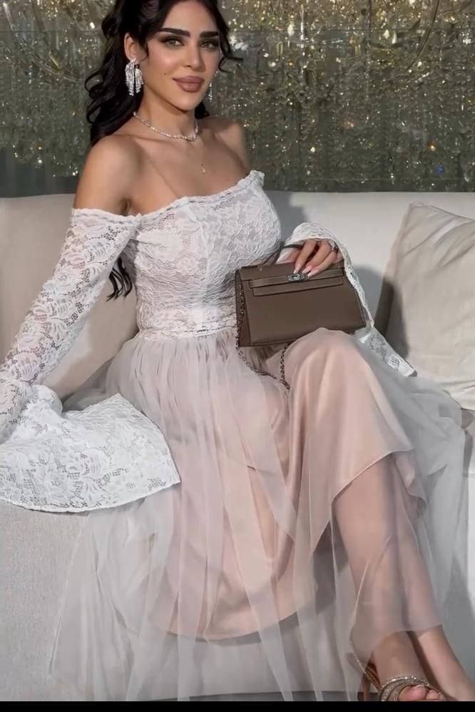 تميزي بإطلالة حالمة مع هذا الفستان الراقي الذي يجمع بين الرقي والرومانسية في تصميم فريد. يتميز الفستان بكورسيه دانتيل بأكمام طويلة واسعة تضفي لمسة كلاسيكية أنثوية ساحرة، مع قصة مكشوفة عند الأكتاف تعزز جمال الإطلالة.