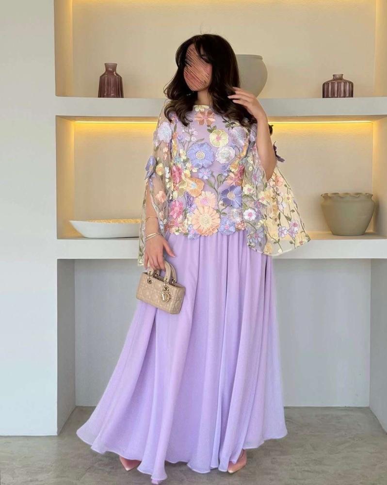 الفستان في الصورة يتميز بتصميم أنثوي ناعم وأنيق، يجمع بين الرقي واللمسة الربيعية. الجزء العلوي مصنوع من قماش شفاف مطرز بالورود الملونة ثلاثية الأبعاد، مما يضفي طابعاً مفعماً بالحياة والرقي، مع أكمام واسعة تنساب بنعومة وتضفي حركة جميلة. أما التنورة فهي طويلة ومنسدلة بلون بنفسجي فاتح (ليلكي)، بتصميم واسع يمنح الفستان لمسة من الفخامة والانسيابية. الإطلالة مثالية للمناسبات النهارية أو المسائية الراقية، وتضفي حضوراً ساحراً ومميزاً