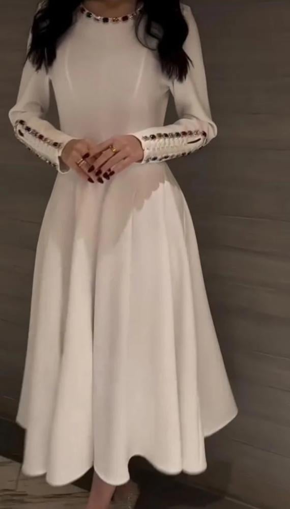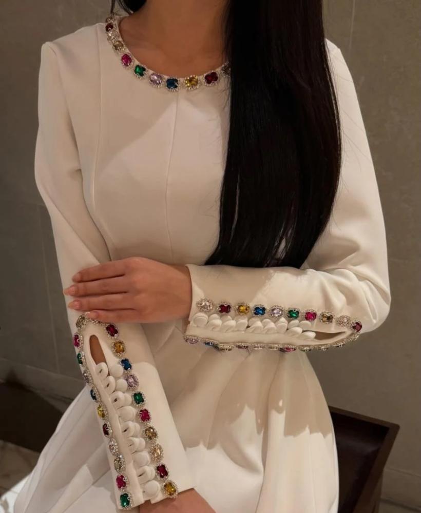 هذا الفستان الأنيق باللون الأبيض يتميز بتصميمه الناعم والفاخر، مع قصّة متوسطة الطول تمنحه لمسة كلاسيكية. يتميز بتفاصيل جذابة عند العنق والأكمام المزينة بأحجار ملونة براقة تضيف لمسة من الفخامة والرقي.