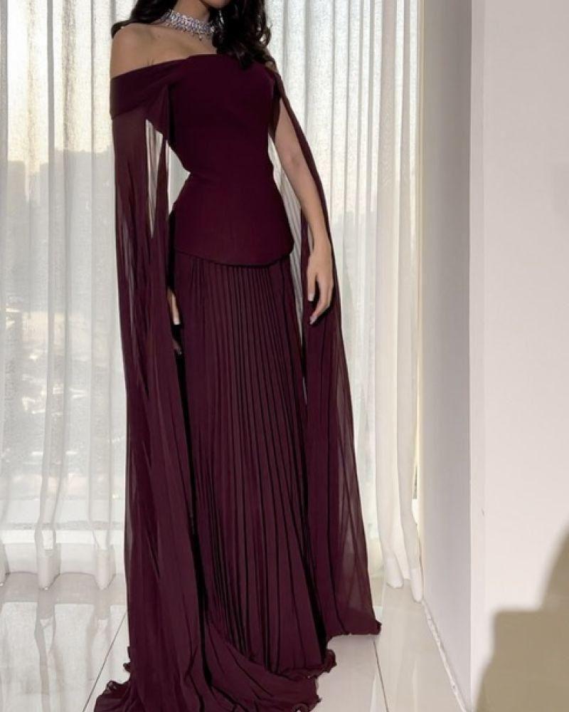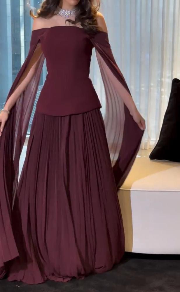 تتميز هذه القطعة بتصميم أنثوي مميز، حيث يتناغم لونها العودي الغامق مع خامتها الناعمة لإبراز جمال وأناقة صاحبتها. يأتي الفستان بأكمام طويلة تضفي لمسة من الأناقة والأنوثة، مما يجعله خياراً مثالياً للسهرات والمناسبات الرسمية.