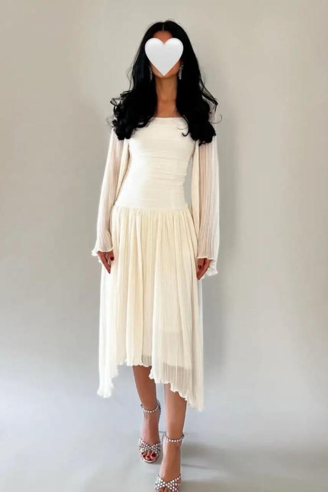 فستان أنيق باللون الأبيض مصمم بأسلوب رومانسي أنثوي. يتميز الفستان بقصة ضيقة عند الجزء العلوي مع أكمام طويلة واسعة تضيف لمسة كلاسيكية فاخرة. القماش خفيف ومريح مع تنورة بطول متوسط غير متماثل وحواف مموجة، مما يمنحه مظهرًا أنيقًا وعصريًا.