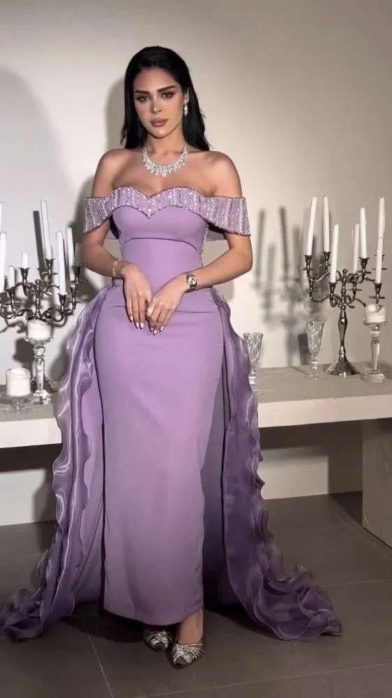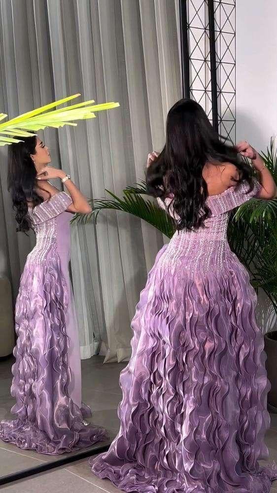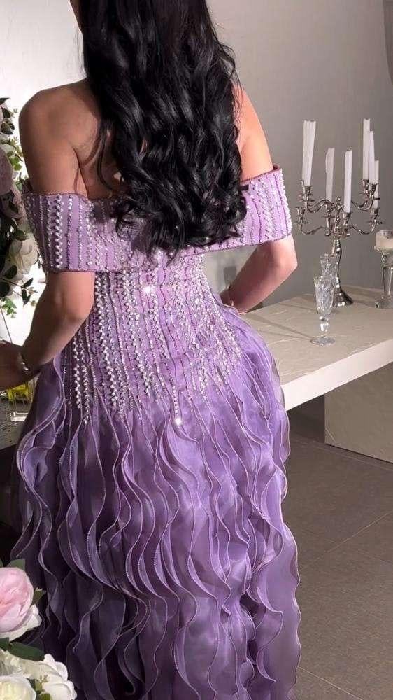 الفستان يتميز بتصميم فاخر وأنيق باللون البنفسجي الليلكي، يجمع بين الرقي والأنوثة في آنٍ واحد. يأتي بقصة ضيقة تبرز جمال القوام، مع أكتاف مكشوفة مزينة بتفاصيل لامعة أنيقة تضيف لمسة من الفخامة.