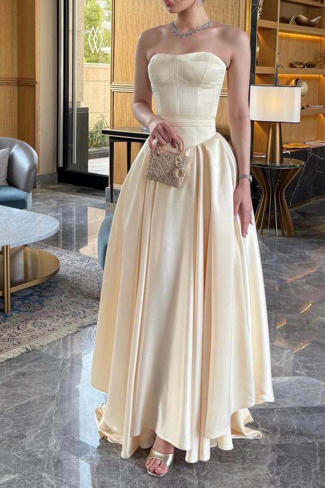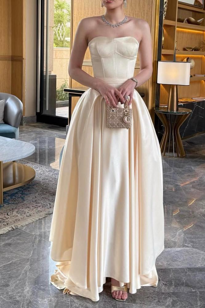 فستان سهرة فاخر باللون العاجي الفاتح، مصمم بأسلوب راقٍ يعكس الفخامة والرقي. يتميز بصدريته الكورسيه التي تبرز جمال القوام وتمنح شكلاً متناسقاً، بينما تنسدل التنورة الواسعة بأناقة من الخصر لتمنح إطلالة ملوكية انسيابية تلفت الأنظار. قماش لامع فاخر يضفي لمسة من الإشراق، مع قصة بدون أكمام تزيد من جاذبية التصميم. خيار مثالي للمناسبات الرفيعة وحفلات الزفاف والسهرات الفاخرة حيث تلتقي البساطة بالفخامة في إطلالة واحدة لا تُنسى
