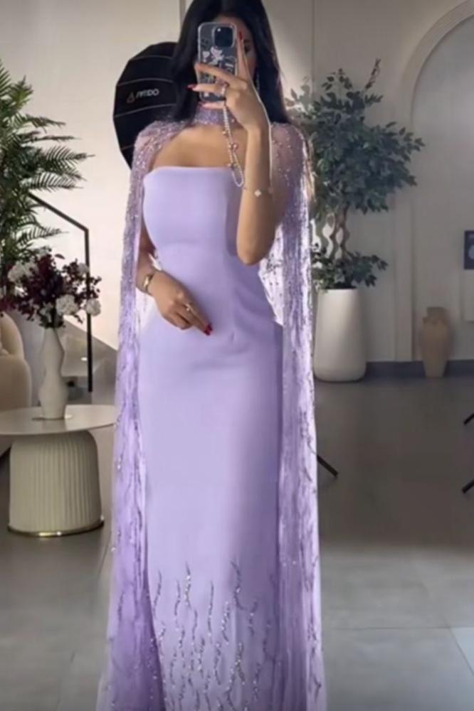 فستان سهرة راقٍ باللون البنفسجي الناعم، يتميز بقصّة ضيقة تبرز جمال القوام بأسلوب أنثوي وأنيق. التصميم مزود بكاب شفاف مزخرف بخيوط لامعة على شكل تموجات أنيقة، يمنح الفستان طابعًا ملكيًا جذابًا. الرقبة مغلقة ومتصلة بالكاب، مما يضيف لمسة مميزة وفريدة من نوعها، ويمنح الإطلالة توازنًا بين الجرأة والرقي. الخامة الانسيابية والانسياب الطبيعي للكاب يضيفان إحساسًا بالفخامة والرقي،