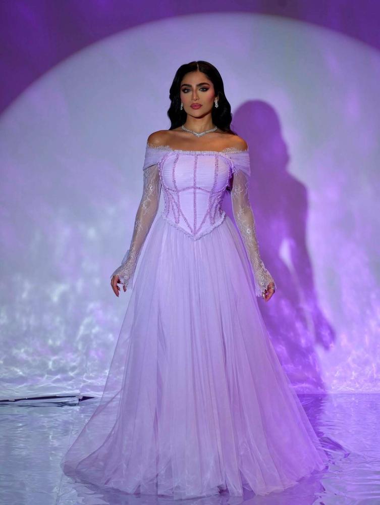 فستان سهرة فاخر باللون البنفسجي الفاتح (لافندر)، بتصميم ملكي يجمع بين الأناقة والرقي. يتميز بقصّة الأوف شولدر التي تُبرز جمال الأكتاف مع أكمام دانتيل شفافة تضفي لمسة من الرومانسية الناعمة. يأتي الصدر مزداناً بتفاصيل كورسيه بارزة تمنح قواماً مشدوداً وجذاباً، فيما تنسدل التنورة الواسعة بطبقات التول الناعمة لتمنح الفستان حركة انسيابية ساحرة. خيار مثالي لإطلالة أميرية في المناسبات الفاخرة والاحتفالات الخاصة
