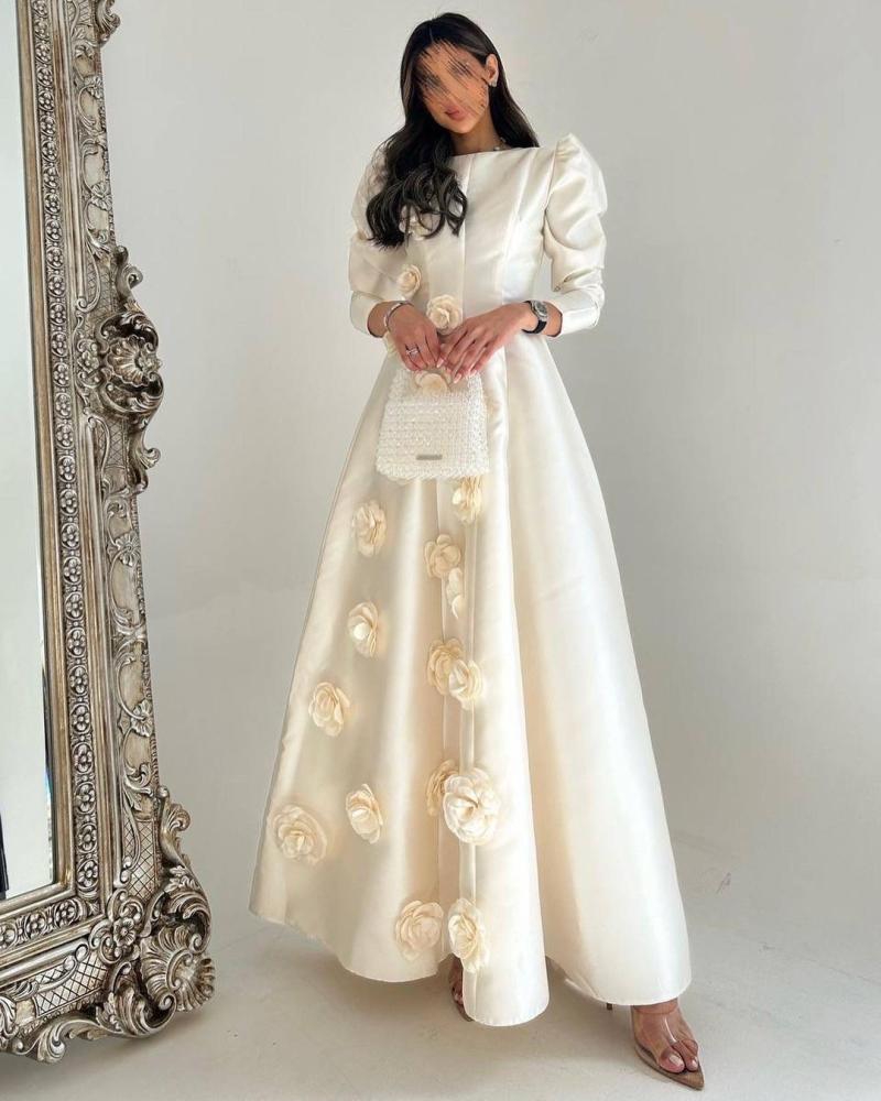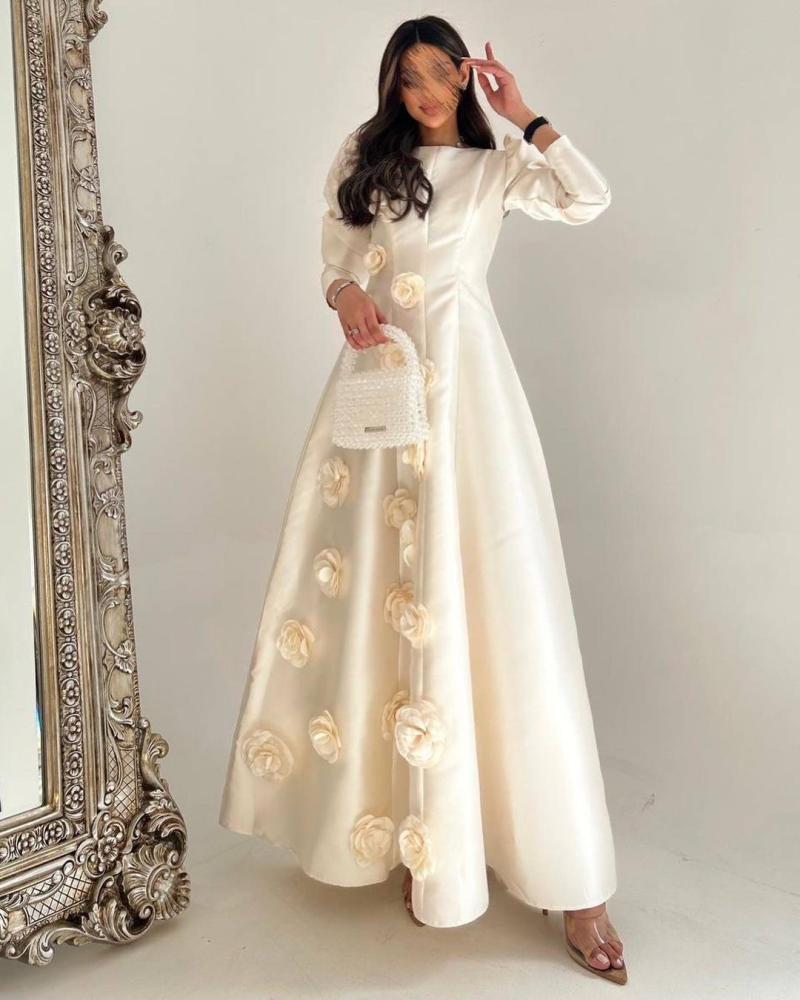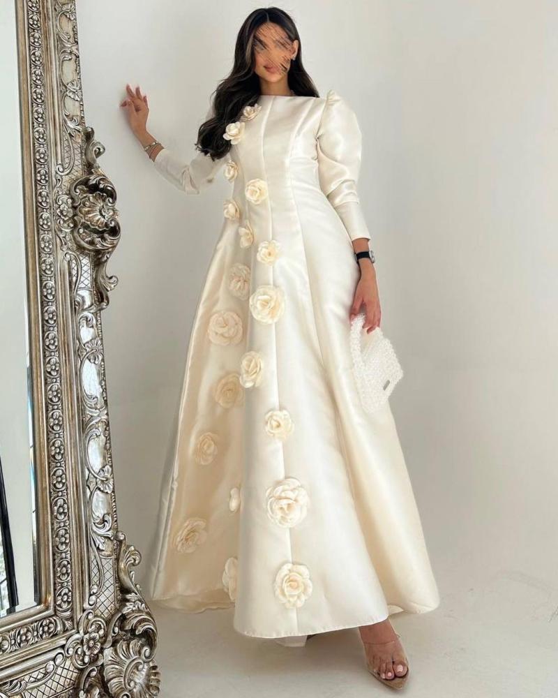 فستان سهرة أنيق مصنوع من قماش لامع بدرجة أبيض كريمي، يتميز بتصميم طويل وواسع لإطلالة راقية. يتم تزيينه بورود ثلاثية الأبعاد على طول الفستان لإضافة لمسة من الفخامة والرقي. الأكمام طويلة ومنتفخة قليلاً لإبراز التفاصيل الكلاسيكية. يناسب المناسبات الرسمية والحفلات، مع حقيبة يد صغيرة لإكمال الإطلالة.