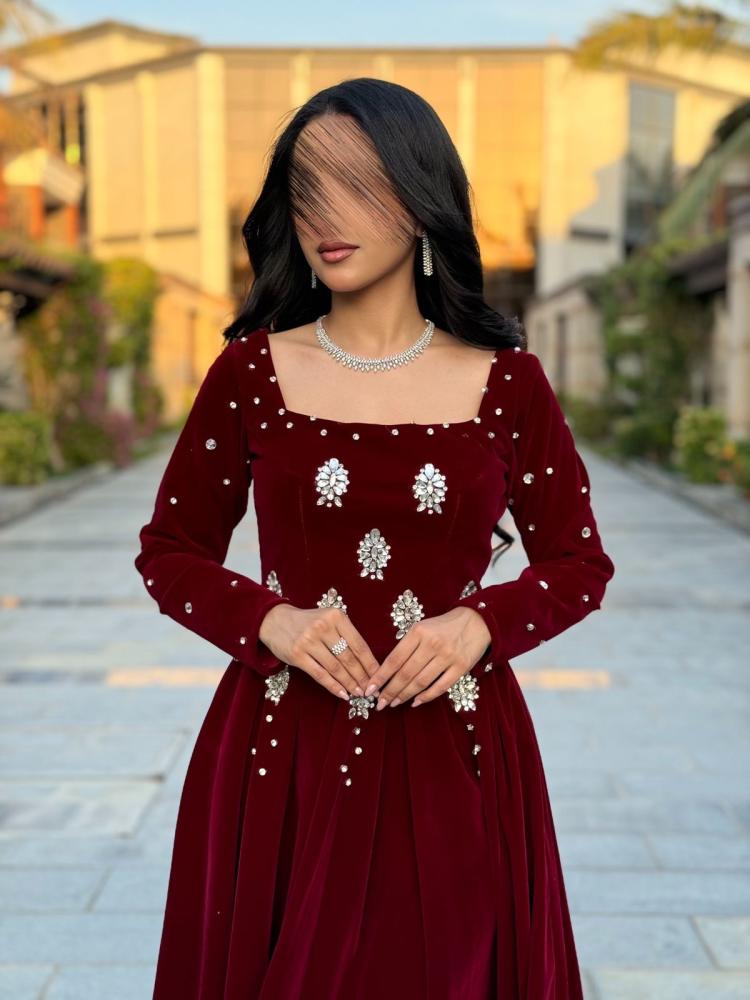 الفستان الأسود ميكادو يتميز بتصميم فخم يجمع بين الأناقة والبساطة. يأتي الفستان بقصة ضيقة عند الخصر ليبرز جمال القوام، ثم ينسدل بتنورة واسعة وطويلة تصل حتى الأرض، مما يمنح الإطلالة طابعاً ملكياً. منطقة الصدر بقصة ناعمة ” أو بتصميم مستقيم يعكس الأناقة الكلاسيكية، مع حمالات رفيعة تضيف لمسة أنثوية ناعمة. قماش المخمل يمنح الفستان لمعة خفيفة تحت الضوء، ويعزز من فخامته ورقيّه. يمكن تنسيق هذا الفستان مع إكسسوارات بسيطة كحقيبة صغيرة أو حلي ذهبية ناعمة، ليكتمل المظهر بأسلوب أنيق وجذاب يناسب المناسبات الراقية