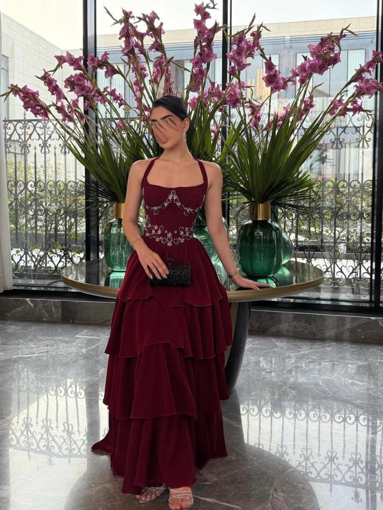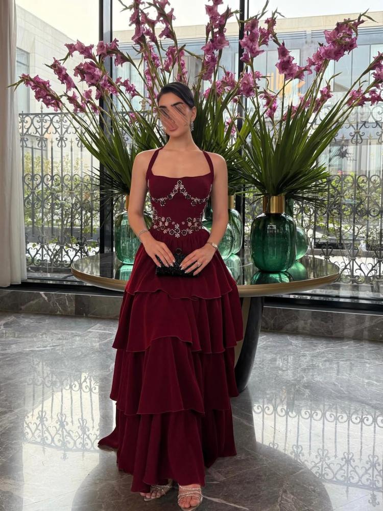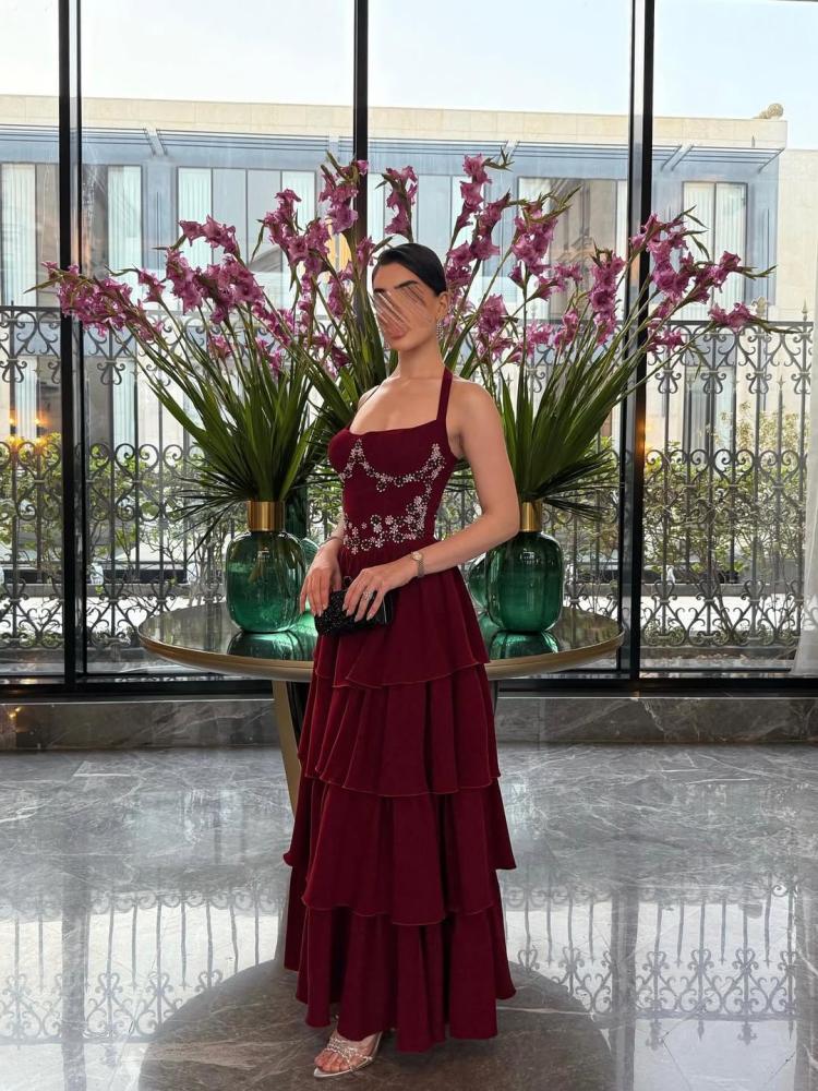 فستان سهرة فاخر باللون العنابي الداكن، يعكس لمسة ملكية بفضل تصميمه المتفرد. يتميز بصدرية مزخرفة بتطريزات لامعة على شكل نقوش ناعمة تضيف بريقاً أنثوياً ساحراً، بينما تنسدل التنورة بطبقات متدرجة تمنح إطلالة ملوكية مفعمة بالحيوية والحركة. حمالاته الأنيقة تمنح ثباتاً وجاذبية، ما يجعل الفستان مثالياً للحفلات والسهرات الراقية. إطلالة تجمع بين الفخامة والأنوثة لتجعلك محط الأنظار في كل مناسبة