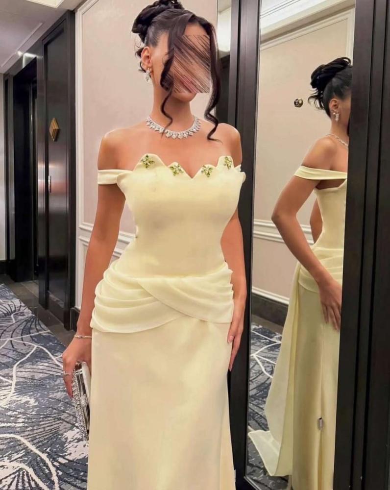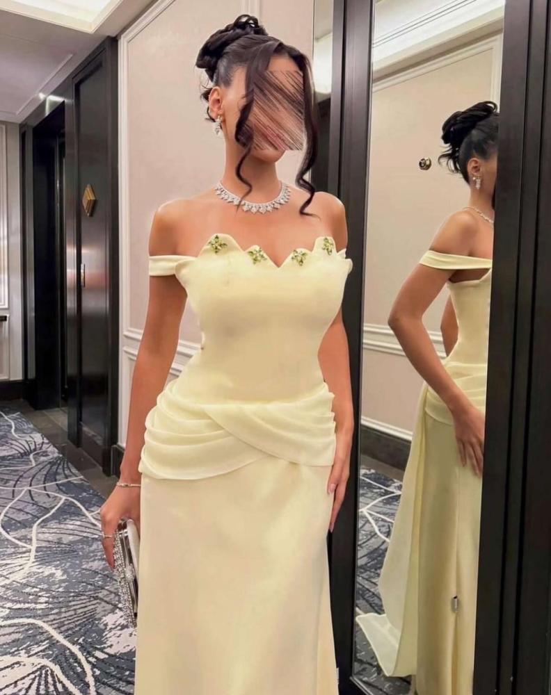 فستان سهرة طويل بلون أصفر فاتح (لون الباستيل) بتصميم أوف شولدر (Off-Shoulder) أنيق، يعكس أنوثة وأناقة راقية. يتميز الفستان بما يلي: