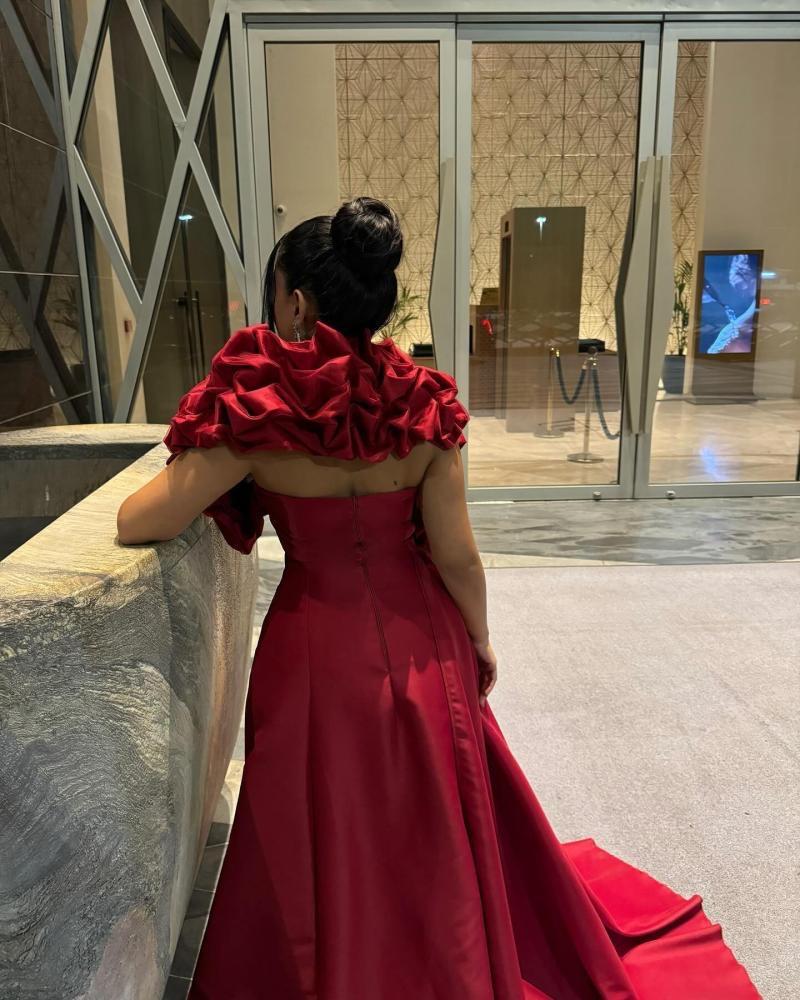 لفستان الأسود ميكادو يتميز بتصميم فخم يجمع بين الأناقة والبساطة. يأتي الفستان بقصة ضيقة عند الخصر ليبرز جمال القوام، ثم ينسدل بتنورة واسعة وطويلة تصل حتى الأرض، مما يمنح الإطلالة طابعاً ملكياً. منطقة الصدر بقصة ناعمة ” أو بتصميم مستقيم يعكس الأناقة الكلاسيكية، مع حمالات رفيعة تضيف لمسة أنثوية ناعمة. قماش المخمل يمنح الفستان لمعة خفيفة تحت الضوء، ويعزز من فخامته ورقيّه. يمكن تنسيق هذا الفستان مع إكسسوارات بسيطة كحقيبة صغيرة أو حلي ذهبية ناعمة، ليكتمل المظهر بأسلوب أنيق وجذاب يناسب المناسبات الراقية